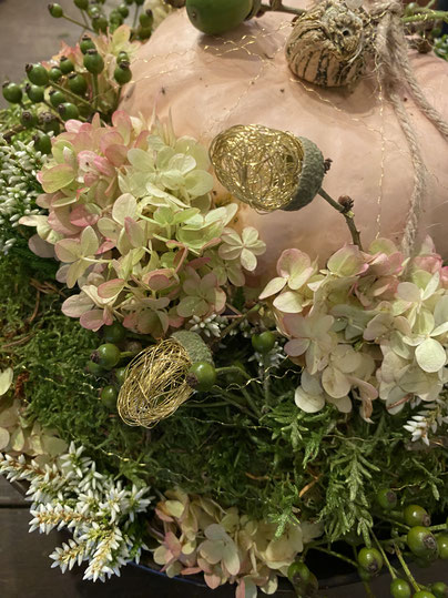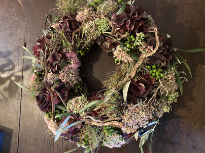 Aus Hortensien, Beeren usw. fertigen wir einen herbstlichen Kranz der sich prima zum Trocknen eignet.